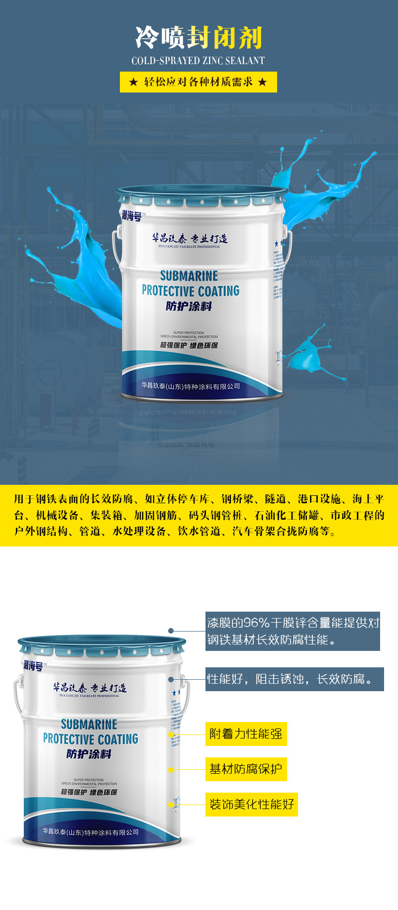 冷喷锌不同于一般的涂料,其干膜含有96%以上的纯锌,能够为钢铁提供很好的阴极保护。即使在很苛刻的环境中,仍能长效保护钢铁表面。防腐性能可以与热镀锌相媲美,甚至优于热镀锌。