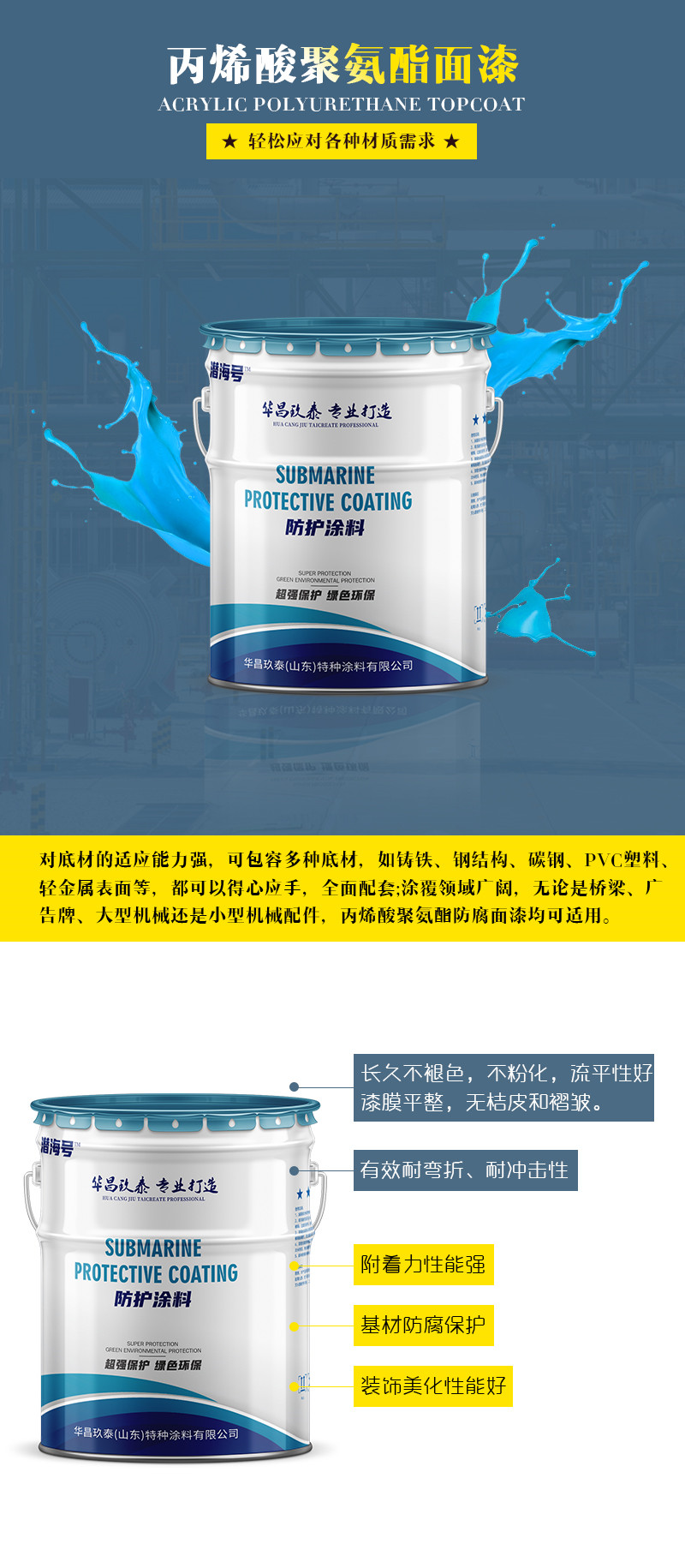 丙烯酸聚氨酯防腐漆,对酸碱耐受度很高,可经受户外风吹日晒雨淋等恶劣环境的考验,另外耐紫外线照射,不容易老化、变黄、褪色,粉化脱落,在户外使用一般可长达7-8年;丙烯酸聚氨酯防腐漆根据不同光泽度的需求定做成无光、高光、哑光(20%~80%)、亮光(≥90%)等各种光泽效果的双组份自干型防腐油漆。