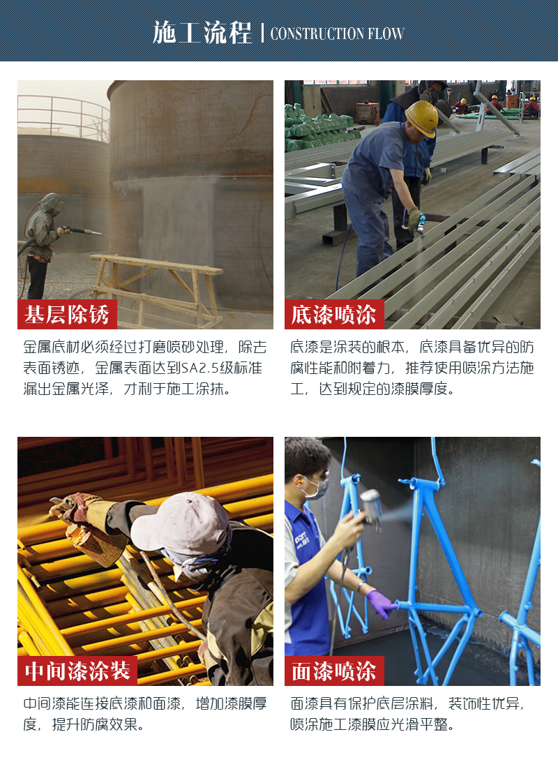 强力地附着在经过处理的钢材、镀锌件及无机锌涂层的表面,提供长期有效的抗腐蚀性和耐气候性。特别适合于1.钢结构:桥梁、市政工程、船舶(甲板和上层建筑;船壳水线;海上平台);2.油罐及管道;3.工业及发电厂:发电厂,废水处理,矿浆和造纸,化工和石油化工;4.交通运输:铁路卡车车厢、巴士,货车的表面;5.混凝土墙面等。