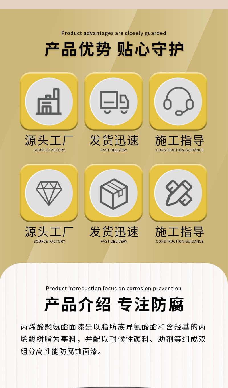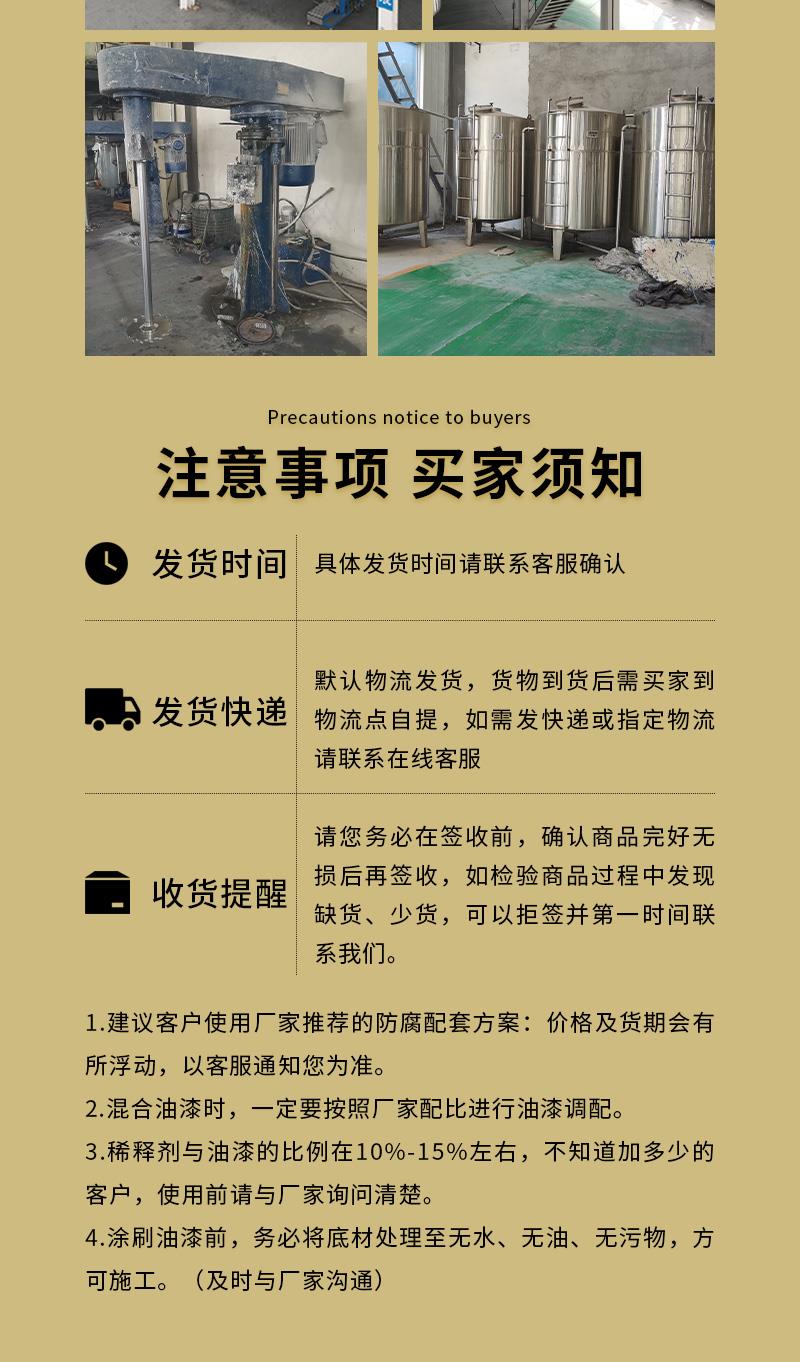 酸聚氨酯防腐漆,对酸碱耐受度很高,可经受户外风吹日晒雨淋等恶劣环境的考验,另外耐紫外线照射,保色效果,不容易老化、变黄、褪色,粉化脱落,在户外使用一般可长达7-8年;酸聚氨酯防腐漆根据不同光泽度的需求定做成无光、高光、哑光(20%~80%)、亮光(≥90%)等各种光泽效果的双组份自干型防腐油漆。酸聚氨酯防腐漆漆膜光泽度高,附着力强,耐候性好,金属装饰性强,色泽饱满,常用于油罐防腐、工程设施、广告牌、集装箱、工程车辆、级工业品的外用装饰涂料等常用的防腐、防锈、装饰等。本公司致力于重防腐行业20年,始终遵循以下方略:提供第三方检测报告,实行三个免费原则:1.随时可免费提供样品;2.免费咨询,制定施工方案;3.免费来厂参观考察;酸聚氨酯防腐漆的特性: 1、耐化学药品性能佳:耐酸、耐碱、耐盐、耐油、耐石油产品、耐温性、耐苯类溶剂和耐水、耐沸水、耐海水及耐化工大气性,是工业材料外装饰的理想产品。防腐性能好,2、施工简便,干燥速度快,工作效率高。3、物理机械性能良好:涂层不仅外观光亮丰满,附着力优异、韧性、耐磨性、弹性和保色性、高光泽性和装饰性等都非常强。 施工参考:1、涂装方式:建议采用高压无气喷涂、有气喷涂,无条件可采用手工涂刷方式2、基底处理:基材处理要求达到Sa2.5级或手工除锈达到St3级以上,无尘、无油脂、无锈、干燥清洁的钢铁结构表面。3、开桶搅拌,将涂料彻底搅匀至桶底无沉积物,按涂料与固化剂规定比例(重量比)加入专用固化剂;充分搅拌均匀熟化15—20分钟后使用。配制好的涂料,禁止重新倒入原漆料中。且在涂料使用后立即盖严密封,以防受潮变质。4、严禁在有雨、雾、雪和较严重灰尘条件下施工。适宜施工温度为0--35℃,涂装间隔时24小时以上更佳。