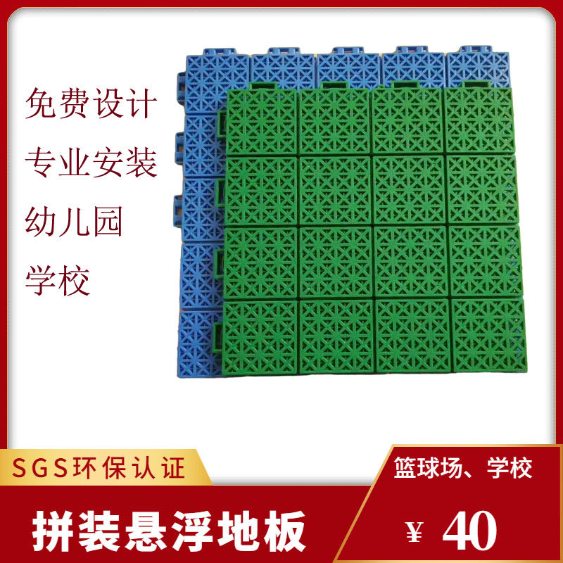 悬浮地板的常见规格有25*25厘米、30.5*30.5厘米、34*34 58*58厘米这几种规格。花型有单层米字格、双层米字格、菱花、风车、魔方等等。参数方面有单块悬浮拼装地板均匀受压15KN历时1分钟,无任何破损现象。悬浮地板施加载荷1500N时,不应有裂纹、断裂、劈裂、漆膜等损坏。单块悬浮地板的平整度≦0.5mm。外观质量的要求是地板颜色均匀一致,无明显色差;悬浮地板的摩擦系数在5-0.7之间,地板表面无龟裂、起泡、塑化不良,地板表面无毛刺。悬浮地板针对球的反弹率≧90%