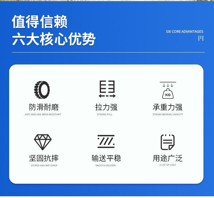 橡胶过滤带上、下覆盖胶可根据工况条件采用不同的配方,满足耐酸碱、耐热、耐寒、耐油等不同要求;橡胶过滤带成型和硫化采用一次整体复合工艺,确保带体的平整和性能的稳定。
