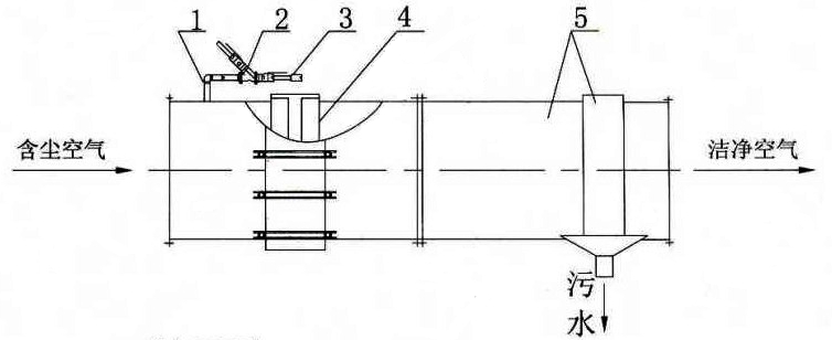 含尘空气经风机动力吸(压)入捕尘器,通过振弦过滤器时,在来流方向上设置的水喷雾器向振弦过滤板上喷雾,附有水幕的纤维能使粉尘湿润增重或凝并或滞留。同时由于通过的含尘气体使纤维在气流冲击下产生振动。强化了水雾粒与含尘气体中粉尘融合,提高了对微细粉尘的捕获,由于振弦过滤器自身纤维的自净能力,及喷雾器不断向过滤器喷雾,使经过过滤器的含尘气体变成湿润含尘液气流,含尘液气流通过旋流器叶片形成高速旋转的液气流,在离心力的作用下将含尘水雾抛向脱水筒内壁形成污水流,通过脱水环下排污口流出机外或进入循环过滤水箱重新经喷雾泵站循环使用。