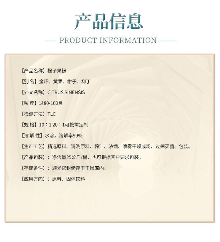 【产品简介】橙子(学名:Citrus sinensis英语:orange),是芸香科柑橘属植物橙树的果实,亦称为黄果、柑子、金环、柳丁。橙树属小乔木。果实可以剥皮鲜食其果肉,果肉可以用作其他食物的调料或附加物