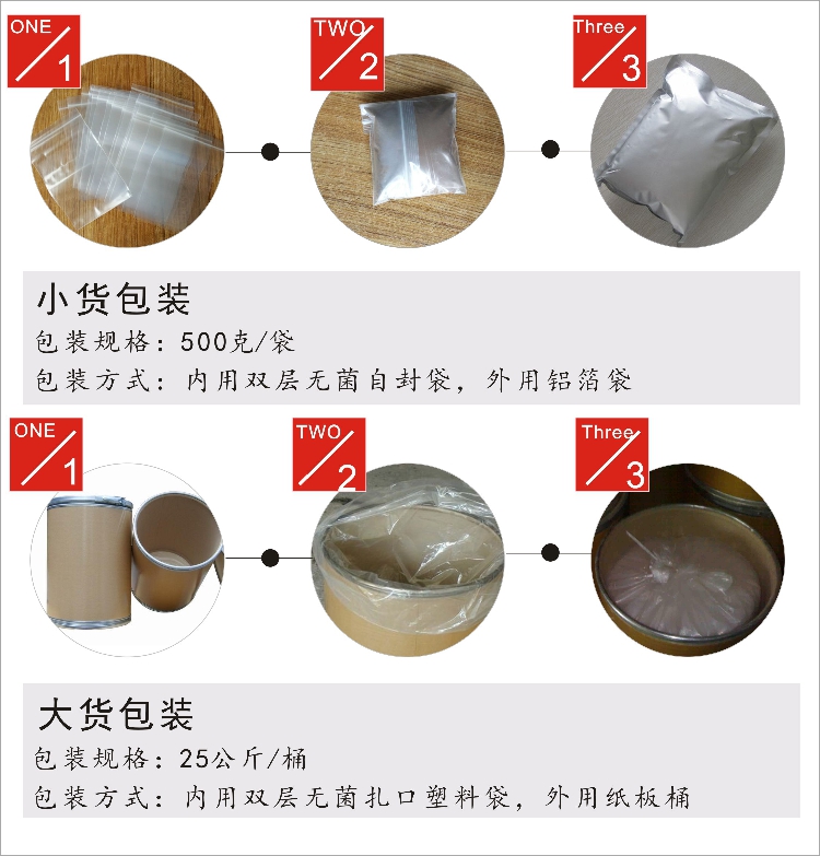 【产品包装】:内膜+铝箔+圆纸板桶(25公斤/桶)。