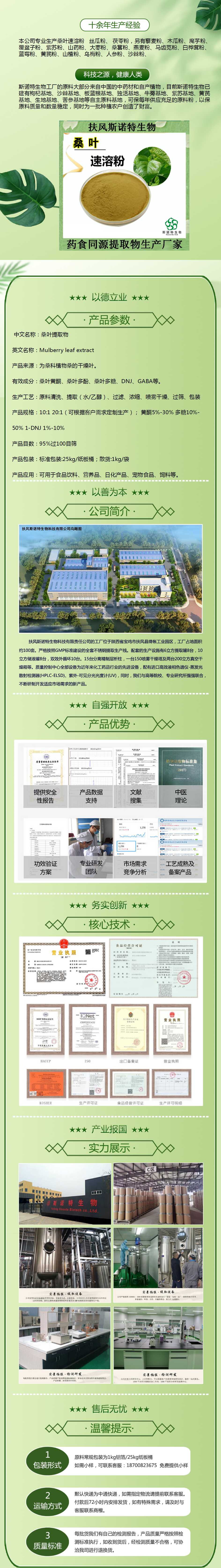 【产品简介】本公司生产的桑叶提取物以桑叶为原料,采用目前较为先进的喷雾干燥技术加工而成。