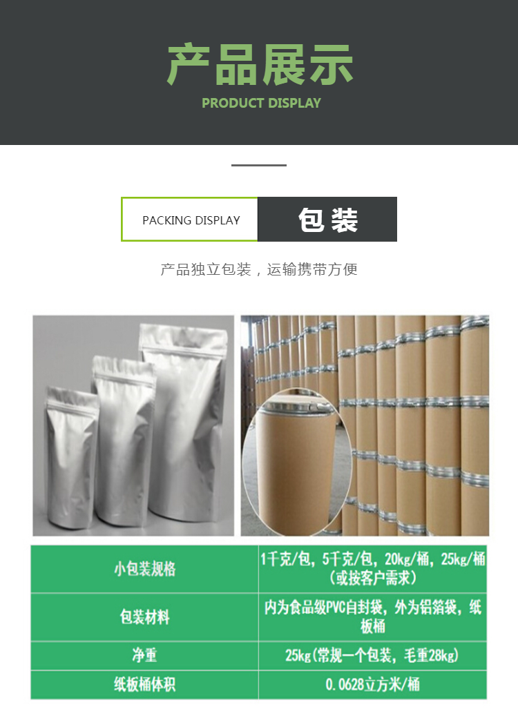【产品包装】内用双层塑料袋1公斤铝箔,外用纸板桶(25公斤/桶)