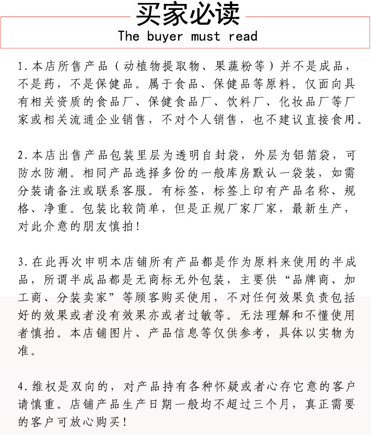 我厂大量生产提取物原料,采用高质量原材料进行生产。每个生产流程都严格把控,再确保每样产品都是合格后,方可出厂销售!客户的满意,就是我们一贯的追求!