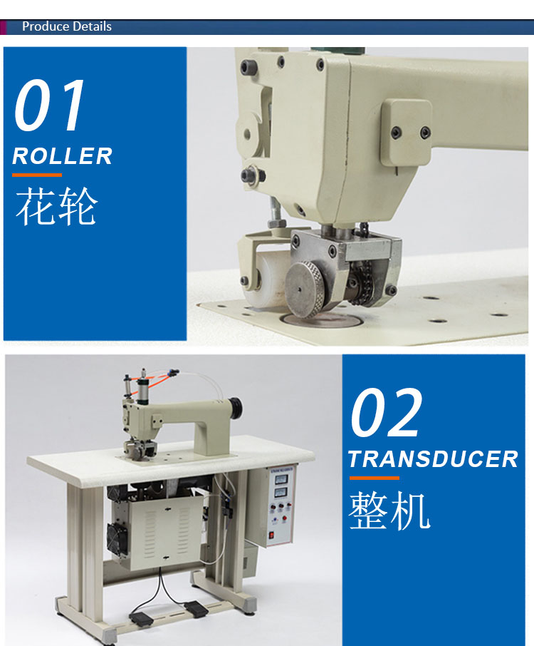 产品介绍: 大威DEVEY超声波缝合机主要应用医用防护服,居家服装,包装制袋,纸尿裤卫生巾。。。等产品无缝焊接缝制压边,可搭配不同超声波模具,实现不同压边缝制花型,实现超声波花边机功能,让产品缝合更好看美观。