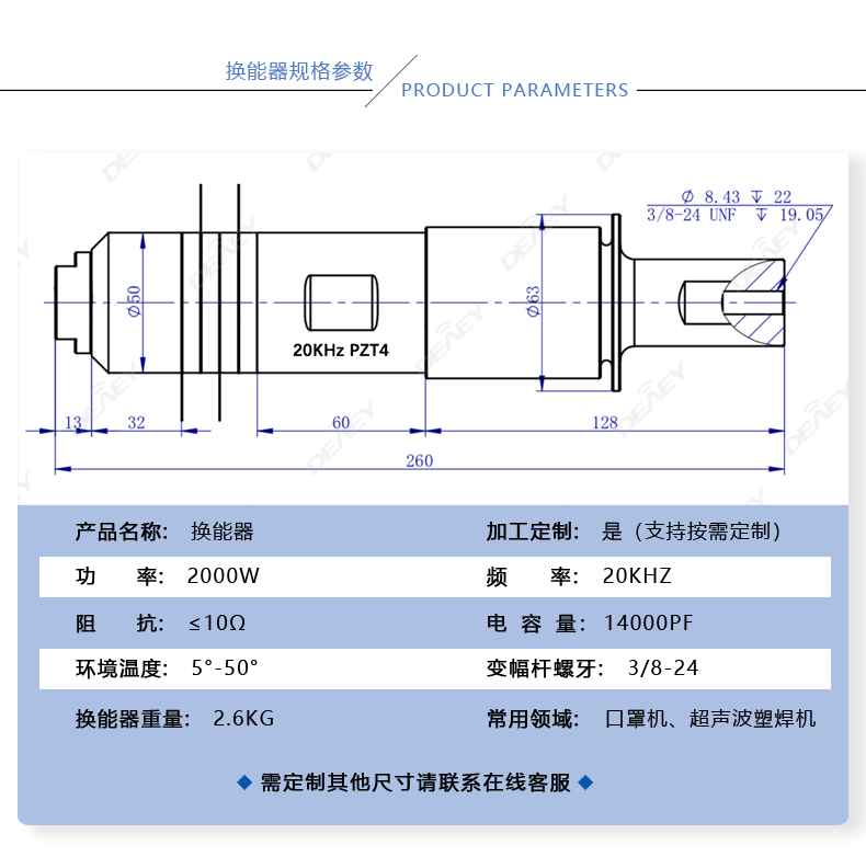 20k2000w超声波换能器,自主研发生产的压电陶片,航空铝材配件,采用国际先进的仿真技术结合自主研发的高精度装配仪器精致而成, 从源头技术开始研发生产,保证了换能器产品和应用技术参数的稳定性;搭载不同的发生器和模具焊头,可以适用不同的超声波设备...