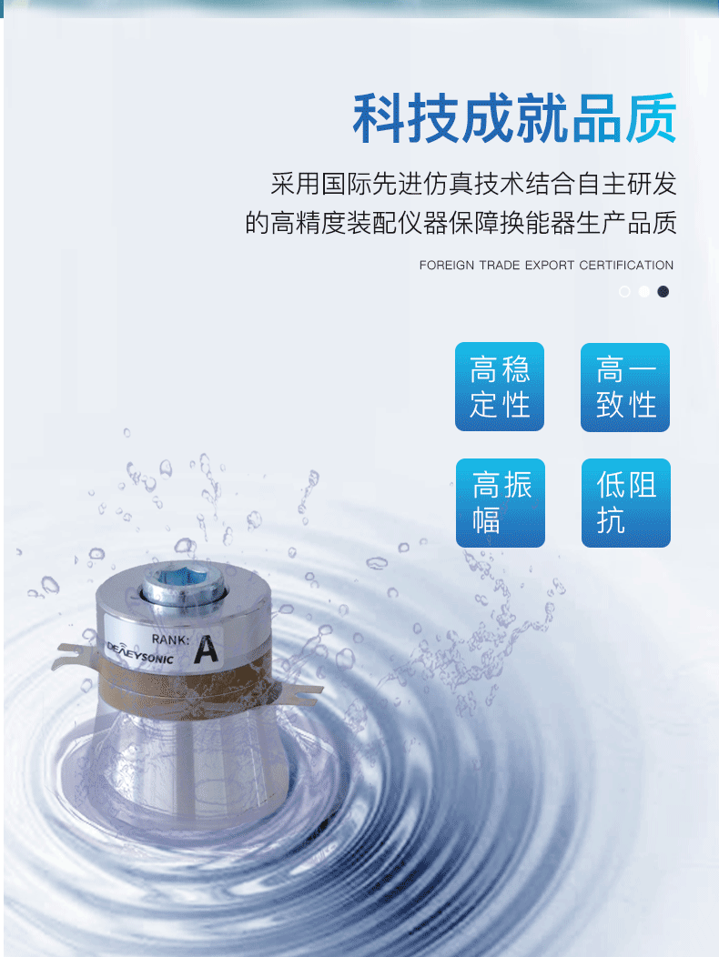 3、超声波振子换能器耐热性:压电陶瓷材料耐热性好,可扩大使用温度范围,同时Q值高,谐振阻抗小,发热量小;