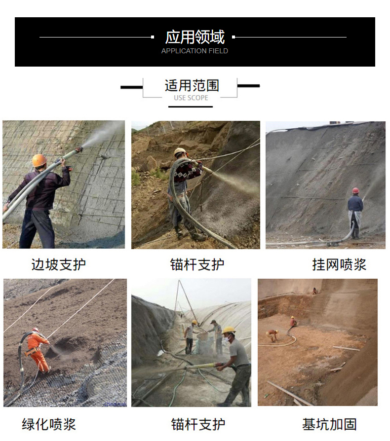 喷浆机一般用在矿区井下作业,也叫矿用湿喷机。其实,混凝土喷浆机的用途广泛,除了在矿区利用外,还可用来灌溉,施肥,喷洒农药等日常护理及土壤改良工作。此外,湿式喷浆机还适用于岩石、硬质土、沙质土、贫瘠地、酸性土壤、干旱地带、海岸堤坝等植物生长困难的地方绿化喷播,用于高速公路边坡绿化、高速铁 路边绿化、矿山复绿、生态恢复、荒漠治理等工程。
