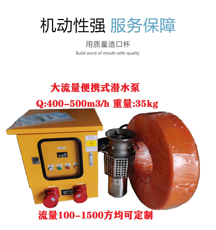 1 . 每 台 便携式潜水泵移动泵车配 置 2台大 流 量 便 携 式 潜 水 泵 : 单台 排 水 量 400-500m3/h , 扬程 0- 15米 , 水 泵 重 35KG 。
