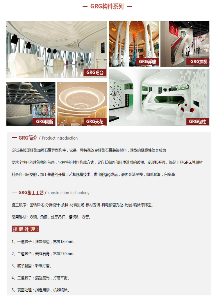 广东饰纪上品GRG构件,经过特殊改良的玻璃纤维增强型石膏类材料,拥有很高的可塑性。具备良好的抗弯,抗拉升等物理性能,能够抵御外部环境造成的破损,变形和开裂。健康绿色环保,选择类型丰富,外观有一种特有的自然亲近感,装饰比较真实;价格较低;对室内空气无污染;施工简单方便。