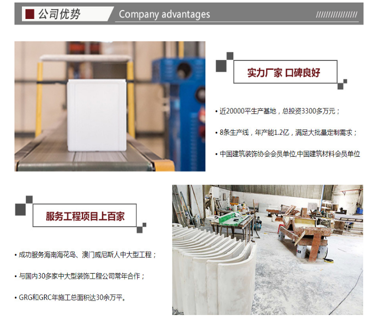 广东饰纪上品GRG构件生产厂家,是一家集设计、生产、施工于一体的多元化公司,规范的内部管理、设计施工产安装经验以及良好的售前售后服务,保证GRG产品良好的信誉保证。我公司拥有规模化生产能力,拥有技术良好的施工队伍,拥有不断开发新产品的技术保障,可以承接大型工程项目。厂家,价格实惠,可包安装。