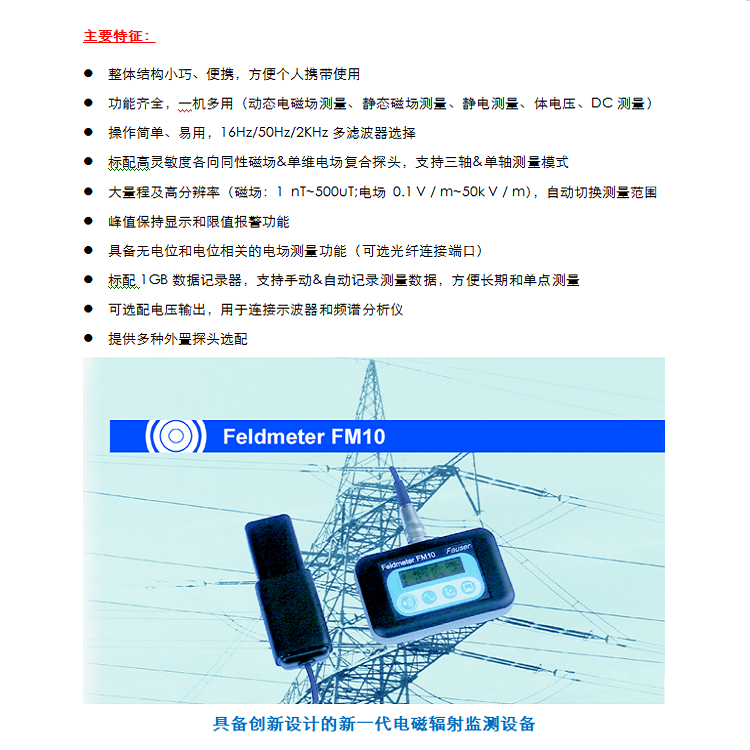 FM10L工频电磁辐射分析仪是一款创新设计的便携性工频电磁场强度检测仪,具有功能多样性和简单直观的操作。内部采用强大的微处理控制技术,对环境测量时无需切换测量范围,可对环境中微小的电磁场信号进行分辨处理,即会同时显示电场和磁场强度,无电位测量避免了因人体对工频电场测量结果的影响。功能多样的探头可实现对动态电磁场、静态磁场(地磁)、静电、体电压、DC电压的测量。FM10L提供数据记录功能和分析功能,利用1GB大数据记录存储模式对环境中400KHz以下的电磁场信号进行场时间数据记录,FM10L软件可对随时间变化的电磁场信号强度分析监测,即适用于单点测量又可长期监测。可满足职业卫生检测、电力环境测量、新能源电车等等测试应用.