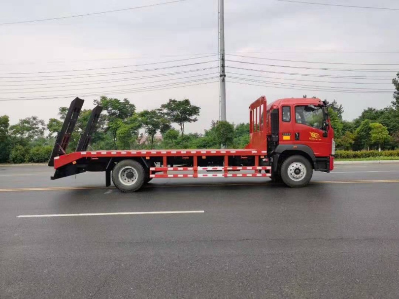 【重汽豪沃G5X单桥平板车】可选装液压爬梯或折叠加长型液压爬梯,斜坡处带后支腿。降低坡度,可拉叉车等中型工程器械,为自己增加一份财富机会。