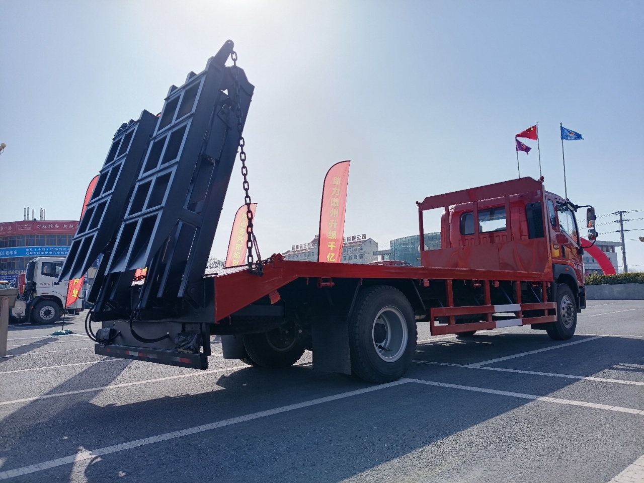 平板有效板长6.5米(含斜坡),宽2.55米(可手动伸展至3.2米),底板横梁采用120*120*5mm方管,底板采用8mm、10mm或12mm花纹板(三种可选),带加密斜支撑,用三道筋+双弹簧加固焊接。