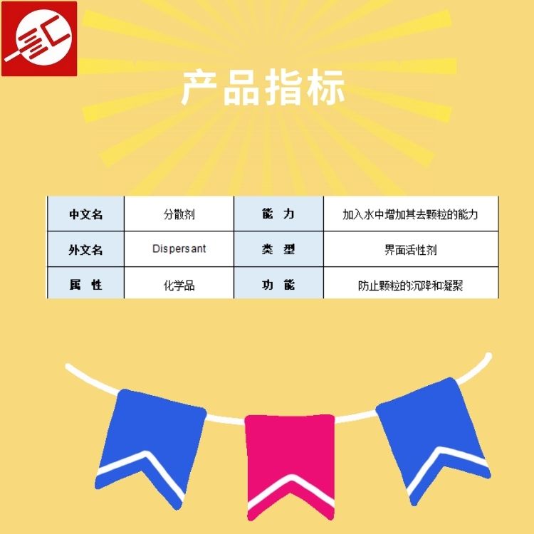 分散剂(Dispersant)是一种在分子内同时具有亲油性和亲水性两种相反性质的界面活性剂。可均一分散那些难于溶解于液体的无机,有机颜料的固体及液体颗粒,同时也能防止颗粒的沉降和凝聚,形成安定悬浮液所需的两亲性试剂。