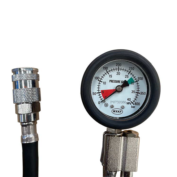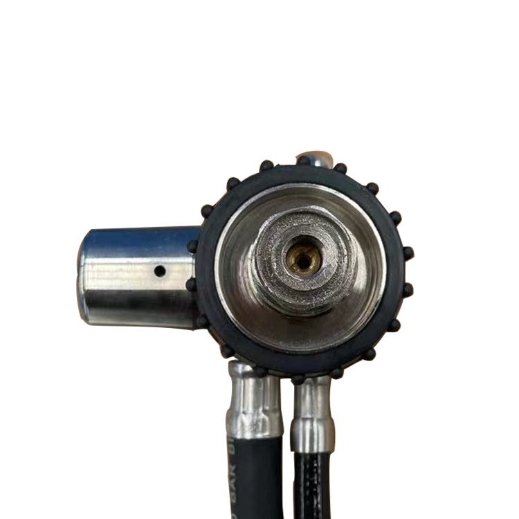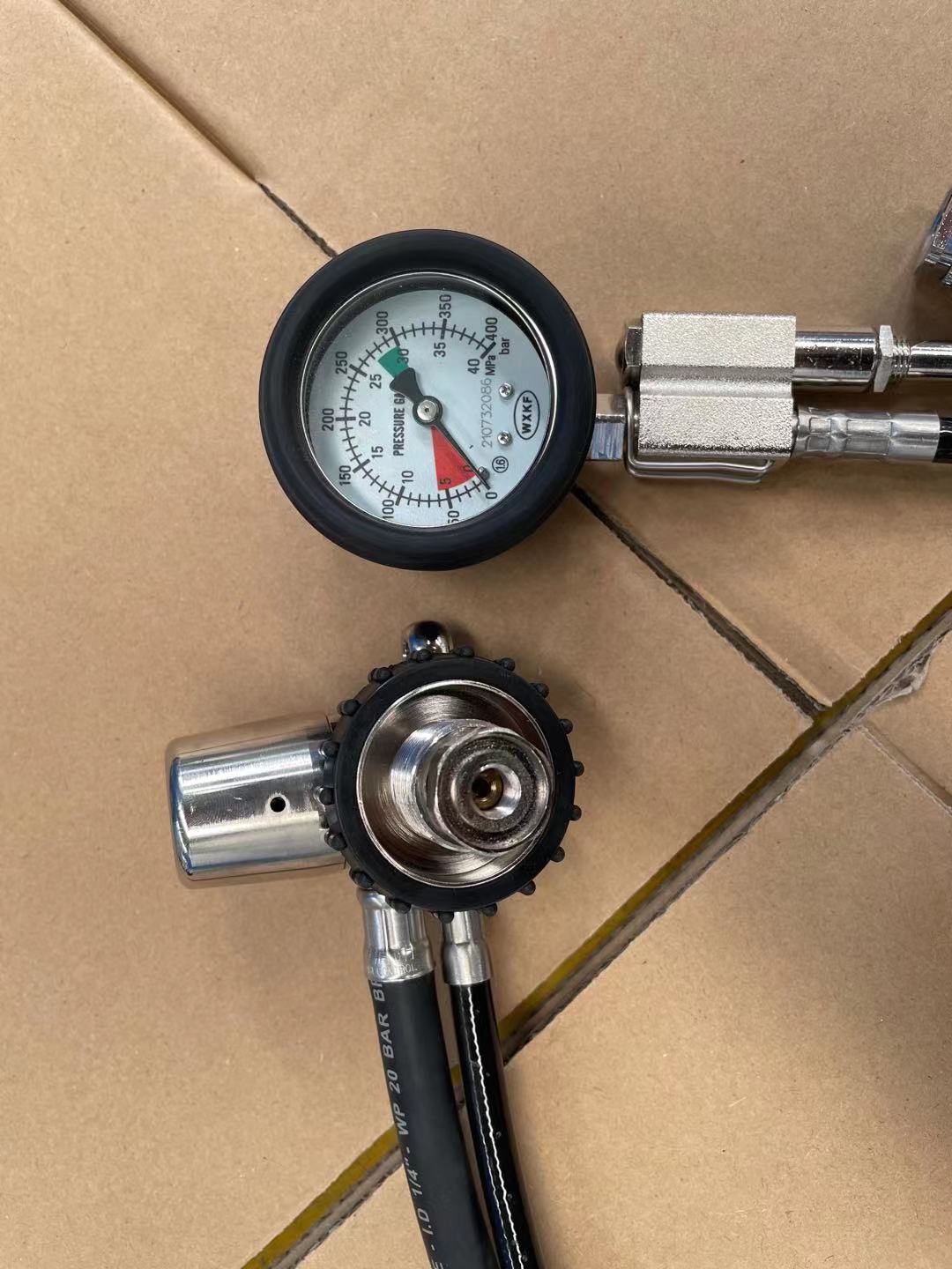减压器: 减压器的作用是将高压气体(30-2MPa)利用力平衡原理减压至(0.6~0.9)MPa. 并且始终稳定在这个范围内。在减压器上设置有安全阀,其开启压力与全排气压力在减压器输出压力设计值的(110~170)%范围内,关闭压力不小于减压器输出压力设计值。减压器通过螺母和瓶阀相连并提供了中亚与高压两个输出接口。本减压器在输出流量设计时已考虑人体的呼吸变化,输出流量小于800L/min,它足以保证供气阀给人体呼吸的空气量。
