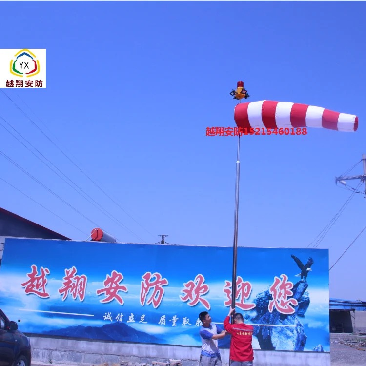 照明型风向标志是各类机场用于观测风力和风向的标志物,可在白天和夜间使用。顶部的4件20W泛光灯对风袋在夜间提供照明,在顶部安装了一盏红色障碍灯标并配有光源主控开关,黑暗时光源感应器会主动开灯并提供照明。