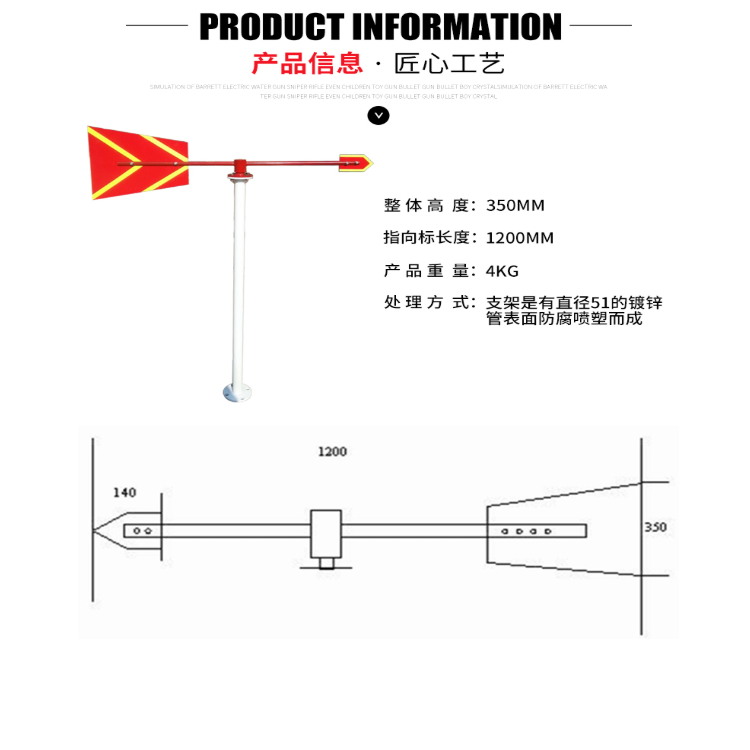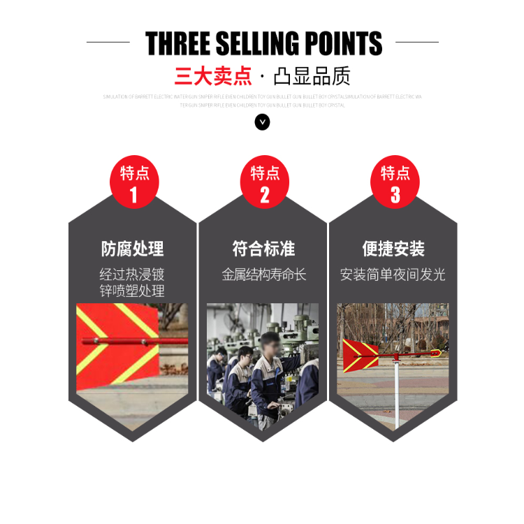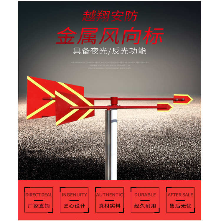 FX-01B夜光金属风向标安放在室外,用于指示风向。金属结构,实现了规范化、化、标准化生产,外表面经热浸镀锌和喷塑防腐处理,使用寿命较长。风向标前翼和尾翼表面具有夜光和反光功能的高科技材料,白天自动吸收储存可见光源,夜间发光;反光功能反射直射光,当光源直接照射风向标时,能够发出醒目的反光。