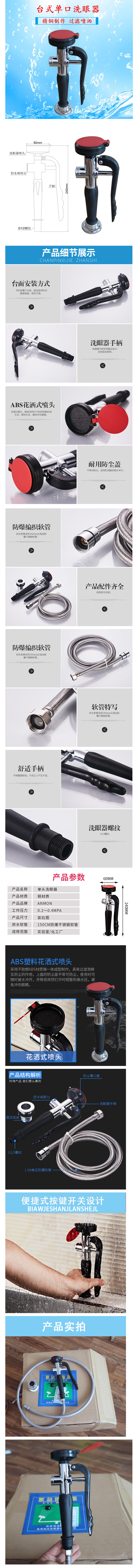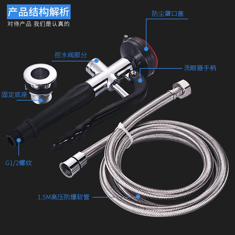 喷淋头:软性橡胶,出水经缓压处理呈泡沫状水柱,防止冲伤眼睛