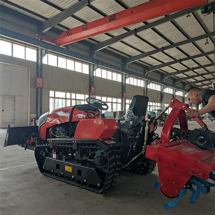 设计比轮式有更好的适应性,底盘低,稳定性好,履带附着系数大,可以有效抵抗倾斜和下坡的坡地。履带旋耕机属于全地形作业机械,具有原地转弯转向的机动性,爬坡和越野性能更强。
