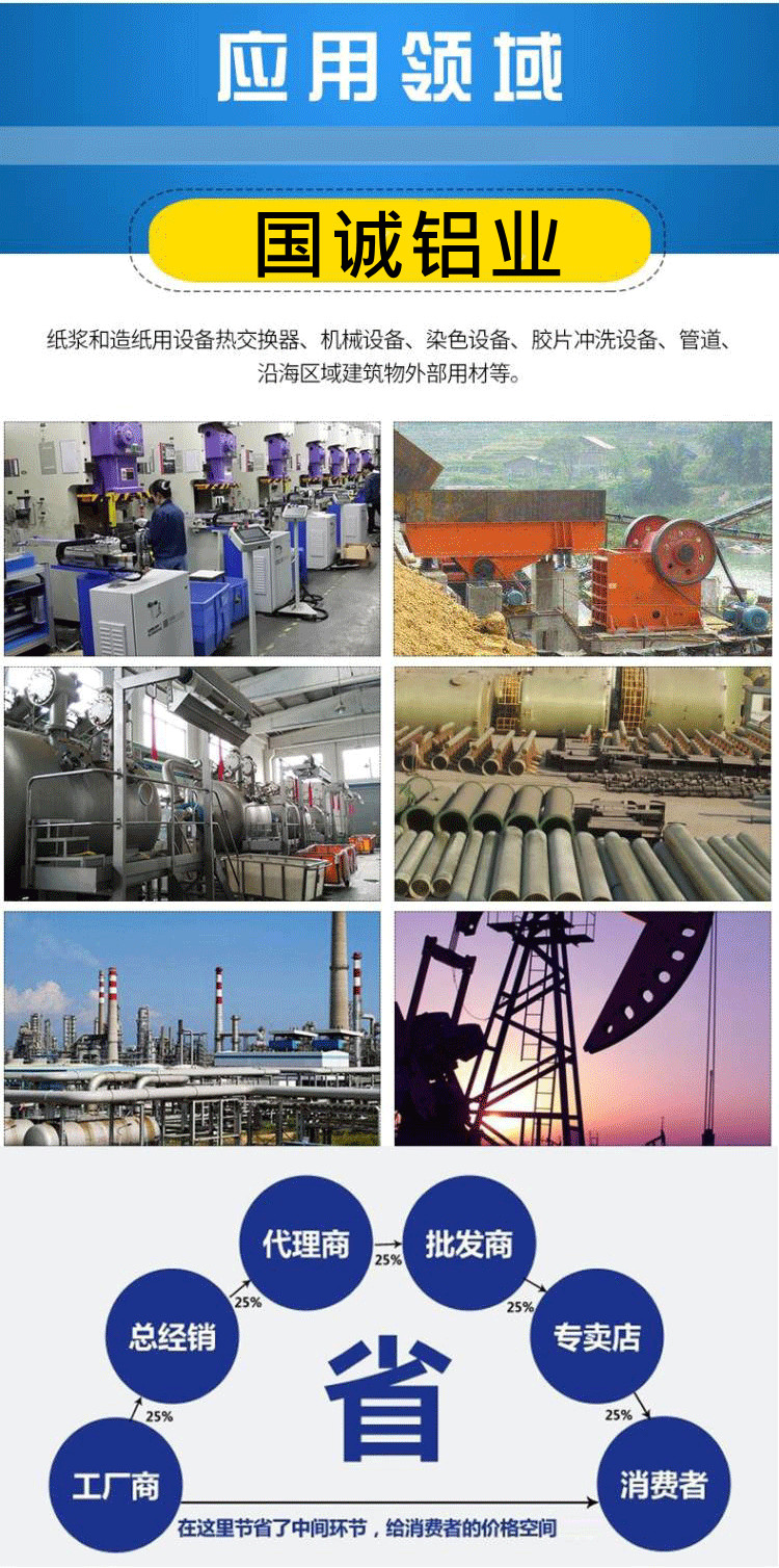 氟碳彩铝板主要用于室内外需要长久保护并始终维持原有颜色的建筑物,特别是高级建筑或者恶劣环境下的建筑物。如公共设施,机场,商业或办公大厦,超级市场,工业厂房,机库和粮库等等。