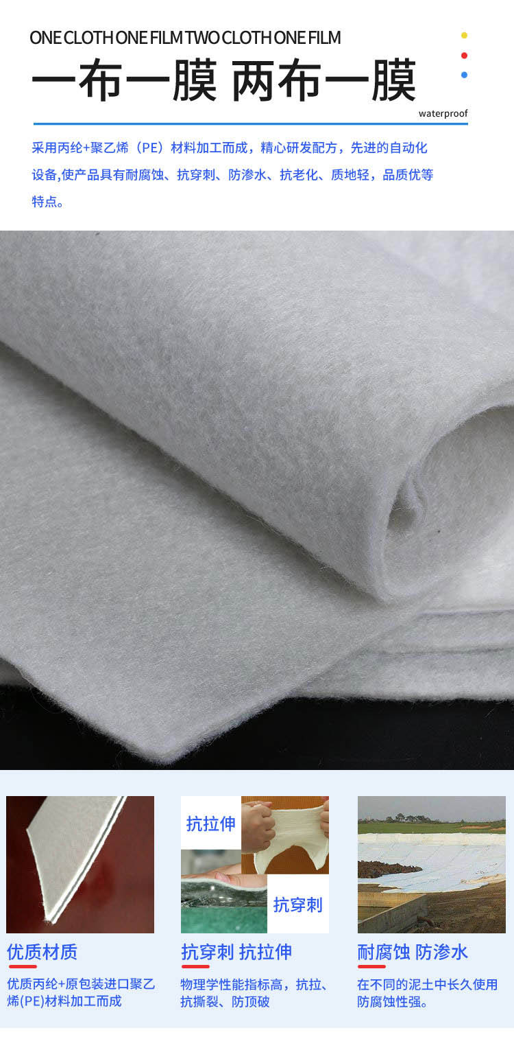 不透水土工布:土工布 土工膜 300克不透水土工布 排水板 蓄排水板 膨润土防水毯 软式透水管 土工席垫等土工材料。产品主要用于国内水利、铁 路、公路、建筑等工程领域。公司是集产品自主研发、生产、设备制造于一体的企业。公司的产品已被广泛用于铁路、桥梁,防水,工程、产品的各项性能指标均符合且高于国家标准要求。公司的外贸主导产品 塑料网络、加筋纤维已出口到加拿大、新西兰、东南亚等国家、公司立足国内市场,积极开拓国际市场,实同市场多元化发展。产品受到工程界专家及国内外客户的一致认可,并赢得了良好的信誉。