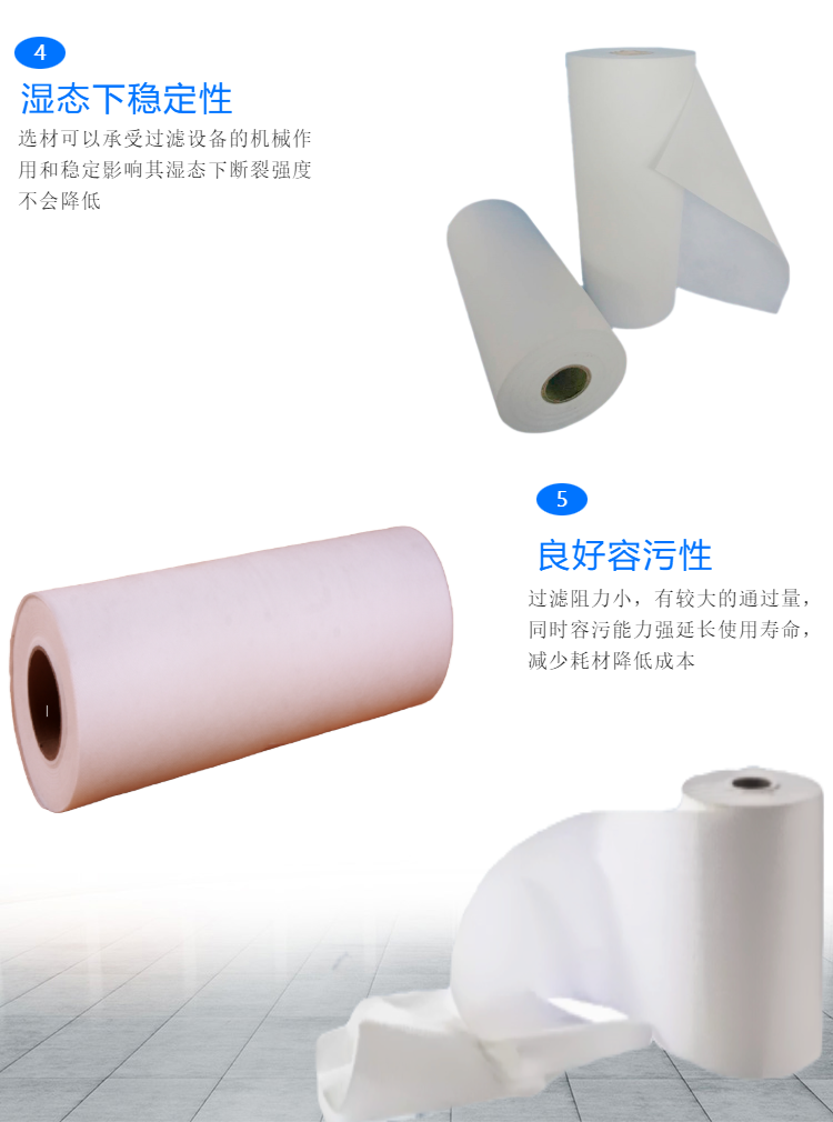 滤布材质性能:耐酸、耐弱碱。耐磨性、耐腐性、回复性很好,导电性能很差。涤纶长纤滤布表面光滑、耐磨性好、强力高、通过拼捻后,强度更高,耐磨性更好,从而织物透气性能好,漏水性快,清洗方便。在合成纤维中丙纶最轻且容易处理,耐温90℃,耐酸碱性优良。故其应用于烟气温100℃以下或酸碱性较强的气---固液---固分离领域。
