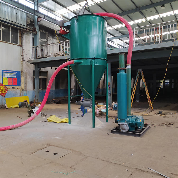 气力输送设备一般由受料器(如喉管、吸嘴、发送器等)、输送管、风管、分离器(常用的有容积式和旋风式两种)、锁气器(常用的有翻板式和回转式两种,既可作为喂料器,又可作为卸料器)、除尘器和风机(如离心式风机、罗茨鼓风机、水环真空泵、空压机等)等设备和部件组成。受料器的作用是进人物料,造成合适的料气比,使物料启动、加速。分离器的作用是将物料与空气分离,并对物料进行分选。锁气器的作用是均匀供料或卸料,同时阻止空气漏人。风机的作用是为系统提供动力。真空吸送系统常用高压离心风机或水环真空泵;而压送系统则需用罗茨鼓风机或空压机。