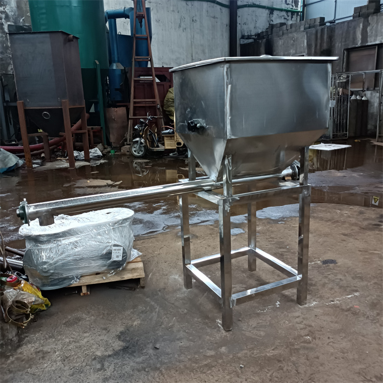 1、料仓,容积从1L到1000L不等,可以圆形也可以方形;可敞口也可以加盖,设置密封;料仓容积较大时,一般要加减重锥,防止料仓内物料重量压在螺旋轴上,导致负荷加大影响正常运行。