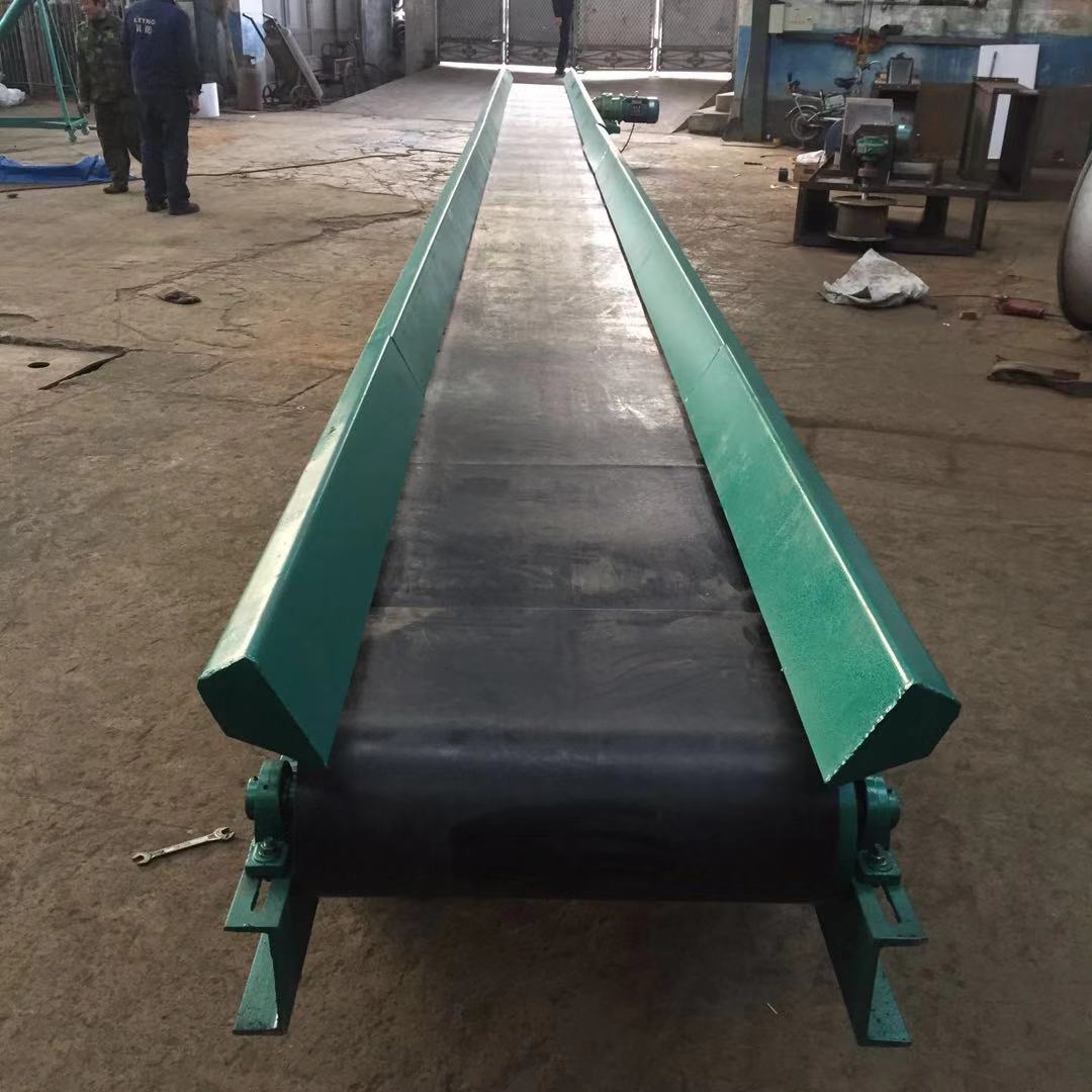 胶带输送机又称皮带输送机,输送带根据摩擦传动原理而运动,适用于输送堆积密度小于1.67/吨/立方米,易于掏取的粉状、粒状、小块状的低磨琢性物料及袋装物料,如煤、碎石、砂、水泥、化肥、粮食等。胶带输送机可在环境温度-20℃至+40℃范围内使用,被送物料温度小于60℃。其机长及装配形式可根据用户要求确定,传动可用电滚筒,也可用带驱动架的驱动装置是组成有节奏的流水作业线不可缺少的经济型物流输送设备。皮带机按其输送能力可分为重型皮带机如矿用皮带输送机。按其支架结构有固定式和移动式两种皮带输送机;按输送方式有普通连续运行、节拍运行、变速运行等多种控制方式;线体因地制宜选用:直线、弯道、斜坡等线体形式。连续或间歇输送100KG以下的物品或粉状、颗状物品;运行高速、平稳,噪音低,可用于上下坡传送;上坡输送等特性。可广泛应用在冶金、矿山、煤炭、港口、交通、水电、化工等部门,进行装车、装船、转载或堆积各种常温状态的松散密度为500~2500kg/m3各种散状物料或成件物品.由单机或多机组合成运输系统来输送物料,根据工艺要求可布置成水平或倾斜的形式,;除了可满足水平或倾斜输送要求外,还可采用带凸弧段、凹弧段与直线段组合的输送形式.输送机允许输送的物料块度取决于带宽、带速、槽角和倾角,也取决于大块物料出现的频率移动式皮带输送机,胶带主要有宽度500、600、650、800mm,1000、1200、1500等特殊规格可以另行设计,皮带输送机是一种连续输送散状物料或成件物品的运输设备,具有结构紧凑,工作性能可靠、输送量大、生产效率高、操作灵便等优点,广泛运用于港口、码头、车站、仓库、料场、厂矿等地输送煤炭、砂石、粮食、化工原料、成件物品等。输送机配有行走轮,可作整机移动,输送倾角可以根据实际需要调整,倾角为22度,变幅机构可以手动调整,也可以采用电动执行;根据输送工艺布置要求,可以单机或多台组成水平或倾斜的输送系统。可根据用户需要而设计制造特殊型号规格尺寸及材质的输送机。