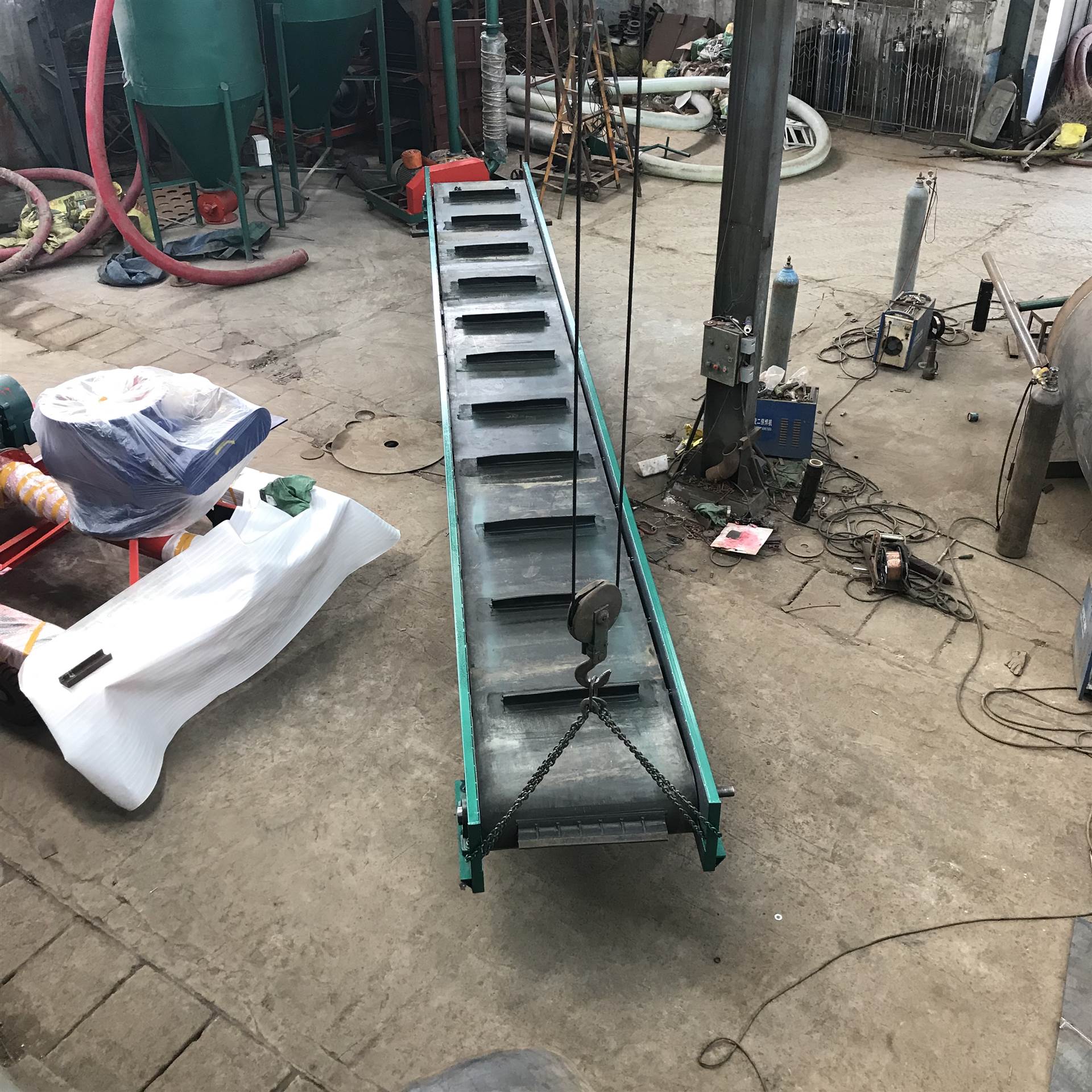 胶带输送机又称皮带输送机,输送带根据摩擦传动原理而运动,适用于输送堆积密度小于1.67/吨/立方米,易于掏取的粉状、粒状、小块状的低磨琢性物料及袋装物料,如煤、碎石、砂、水泥、化肥、粮食等。胶带输送机可在环境温度-20℃至+40℃范围内使用,被送物料温度小于60℃。其机长及装配形式可根据用户要求确定,传动可用电滚筒,也可用带驱动架的驱动装置是组成有节奏的流水作业线不可缺少的经济型物流输送设备。皮带机按其输送能力可分为重型皮带机如矿用皮带输送机。按其支架结构有固定式和移动式两种皮带输送机;按输送方式有普通连续运行、节拍运行、变速运行等多种控制方式;线体因地制宜选用:直线、弯道、斜坡等线体形式。连续或间歇输送100KG以下的物品或粉状、颗状物品;运行高速、平稳,噪音低,可用于上下坡传送;上坡输送等特性。可广泛应用在冶金、矿山、煤炭、港口、交通、水电、化工等部门,进行装车、装船、转载或堆积各种常温状态的松散密度为500~2500kg/m3各种散状物料或成件物品.由单机或多机组合成运输系统来输送物料,根据工艺要求可布置成水平或倾斜的形式,;除了可满足水平或倾斜输送要求外,还可采用带凸弧段、凹弧段与直线段组合的输送形式.输送机允许输送的物料块度取决于带宽、带速、槽角和倾角,也取决于大块物料出现的频率移动式皮带输送机,胶带主要有宽度500、600、650、800mm,1000、1200、1500等特殊规格可以另行设计,皮带输送机是一种连续输送散状物料或成件物品的运输设备,具有结构紧凑,工作性能可靠、输送量大、生产效率高、操作灵便等优点,广泛运用于港口、码头、车站、仓库、料场、厂矿等地输送煤炭、砂石、粮食、化工原料、成件物品等。输送机配有行走轮,可作整机移动,输送倾角可以根据实际需要调整,倾角为22度,变幅机构可以手动调整,也可以采用电动执行;根据输送工艺布置要求,可以单机或多台组成水平或倾斜的输送系统。可根据用户需要而设计制造特殊型号规格尺寸及材质的输送机。