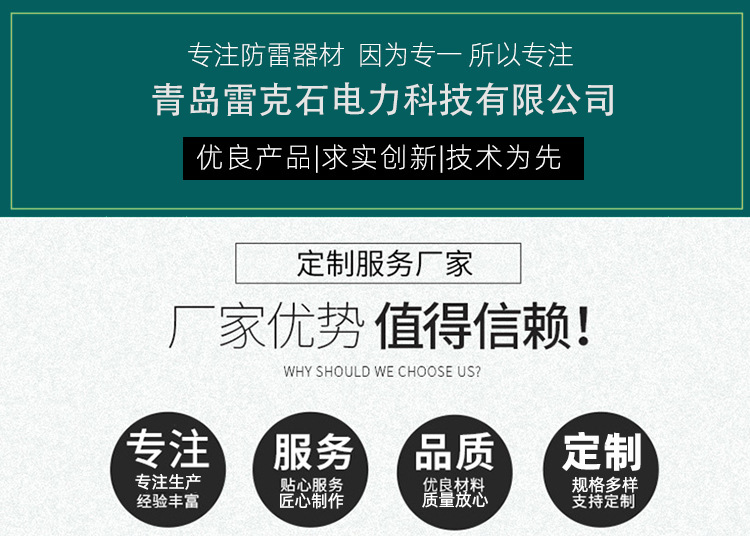 公司主营:雷电预警系统、接地电阻在线监测系统、镀锌钢接地、纯铜接地、铜镀锡接地、铜覆钢接地、镀锡铜接地、不锈钢包钢接地、不锈钢接地、防腐铜覆钢接地、柔性石墨接地、复合石墨烯接地、铜铝稀土合金接地、接地模块、降阻剂、放热焊接焊粉、模具、离子接地极、避雷针、避雷塔、静电消除装置等!