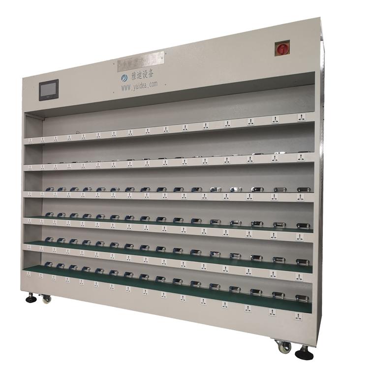 雅迪设备充电器老化柜是以本公司开发的电子负载来模拟电池包充电,采集工作时的电流,来判断充电器工作是否正常。