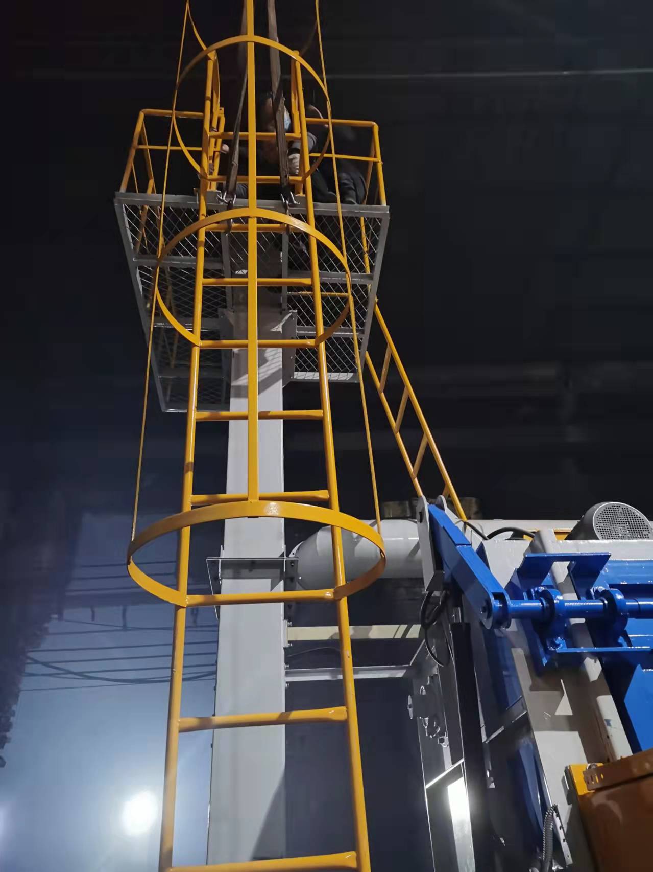 本机从上料开始一直到将处理完毕的工件从机内卸出,整个工作过程都可以自动完成。将需要处理的工件由前段工序自动落入周转箱内,周转箱(需方自备)由辊道输送系统输送到上料斗位置,环链电动葫芦将上料斗平稳的拉起,至点时料斗倾转,斗内工件沿着斗底滑入正在作卷绕运动的橡胶履带上。此后料斗自动下落,抛丸室门自动下降关闭,抛丸器开始向工件投射弹丸以剥离其表面的氧化皮等附着物。抛丸的同时,作卷绕运动的履带带动工件不断地翻滚,使工件的各个表面都暴露在高速弹丸束中而得到均匀的处理。溅落的弹丸穿过密布在履带上的小孔落入抛丸室下部的钢板网过筛,到达集丸斗中,经螺旋输送器水平输送到提升机底部,再被垂直提升到顶部的丸砂分离器中。被净化的弹丸流入储丸仓,再经过供丸闸门重新进入抛丸器参与循环。抛丸时间用时间继电器控制,抛丸结束,经过筛砂后,抛丸室门自动打开,履带反向旋转,处理好的工件被卸出落入皮带输送机,通过皮带输送机落入周转平台上。如此,一个工作循环即告完成。