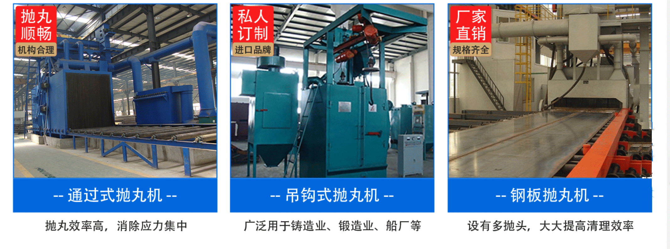 悬链式抛丸机适合于小型铸铁件、铸钢件、锻件及冲压件的抛丸清理,特别适合于锻件、铸件的清理,以去掉工件表面上的粘砂、铁锈、氧化皮、污物等,使工件表面呈现金属本色,消除工件内部应力,提高工件抗疲劳性,增加工件喷漆时的漆膜附着力,并最终达到提高工件表面及内在质量的目的。悬链式抛丸机分为Q38系列悬链式连续抛丸机、Q48系列悬链步进式抛丸机、Q58系列积放式抛丸机。