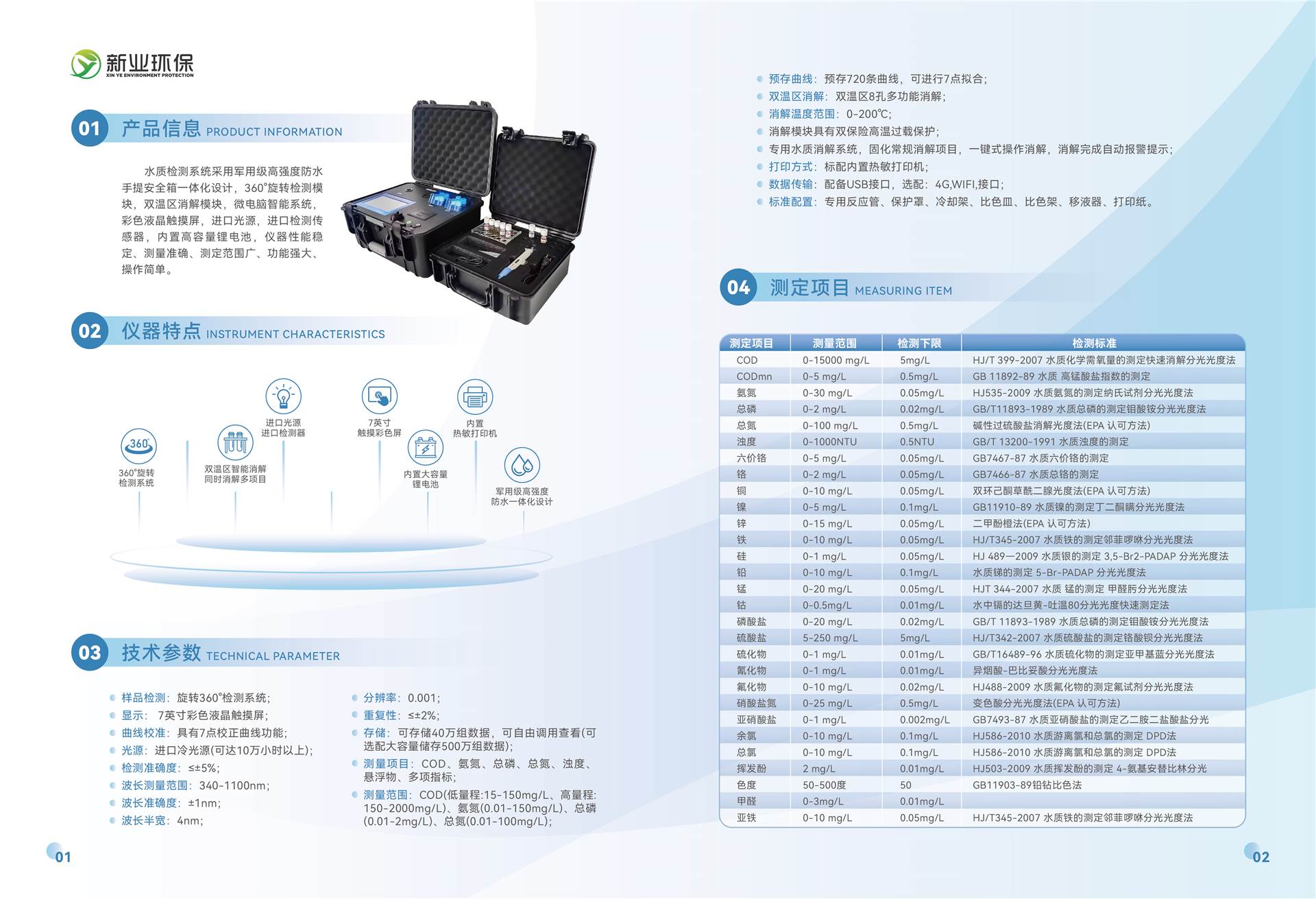COD(5-10000mg/L)、氨氮(0.01-150mg/L)(分段)、总磷(0.01-100mg/L)(分段)、总氮(0.01-100mg/L)