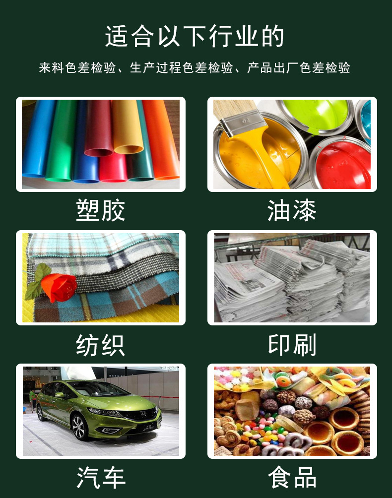 适用于塑胶、喷涂、设计、印刷、服装、印染等行业,可进行色彩配色分析及色彩品质控制。