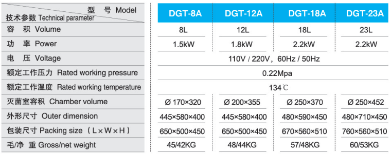 DGT系列 A型(热力真空)灭菌器技术参数: