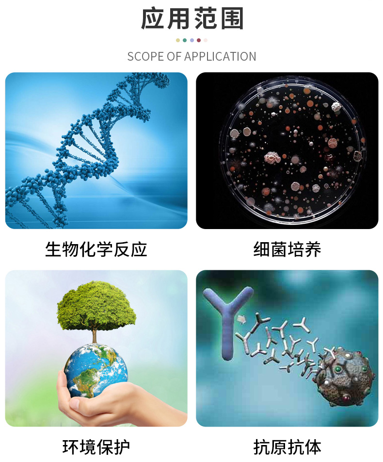 广泛应用于生物化学反应、发酵、细菌培养以及细胞组织研究等。在化学、生物学、分子学、食品、环保等,各项研究领域有广泛的应用。如脱色、染色、显影、定影、纤维素膜的处理、分子杂交、抗原的反应和细胞培养等。