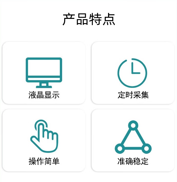 3、中文液晶显示,可显示当前日期时间,各传感器测量数据,存储容量,已存储数据条数等信息。