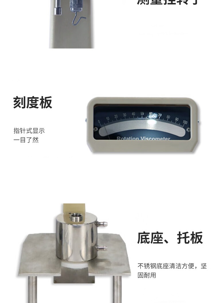 墨、浆料、化妆品、奶油、沥青等的粘滞性。对于不同粘度的液体或不同的测定要求可选用不同的测定单位进行测定。本粘度计具有体积小、重量