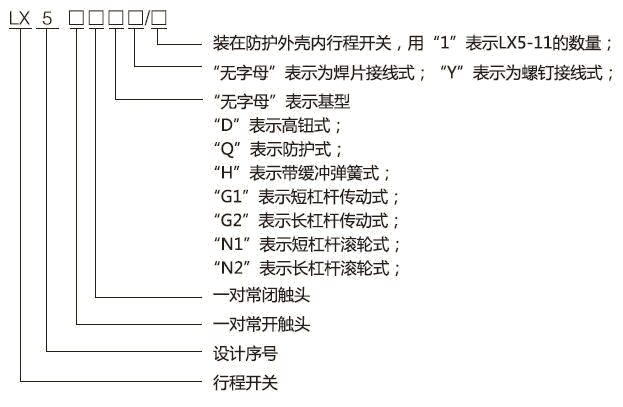 LX5系列行程开关分为接线式、有焊片接线式、螺钉接线式。防护式有开启式、防护式。按钮式有一般式、高钮式。传动式有直动式、杠杆式、滚轮式。