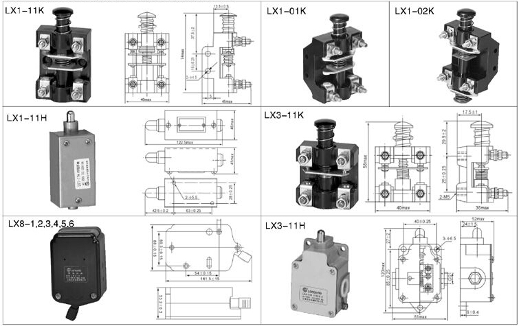 LX1系列行程开关适用于交流50Hz、电压至380V直流电压至220V的控制电路中,作为控制速度不小于0.1米/分的运动机构之行程或变换其运动方向或速度之用。
