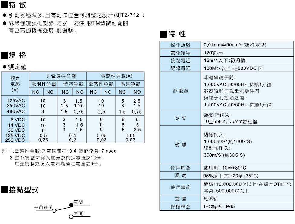 TZ-7000系列限位开关具有多种优点,如结构紧凑、安装方便、性能稳定等。它通常具有常开和常闭两种触点形式,可以根据实际需要选择使用。此外,该系列限位开关还具有良好的防水防尘性能,能够在恶劣的环境条件下正常工作。