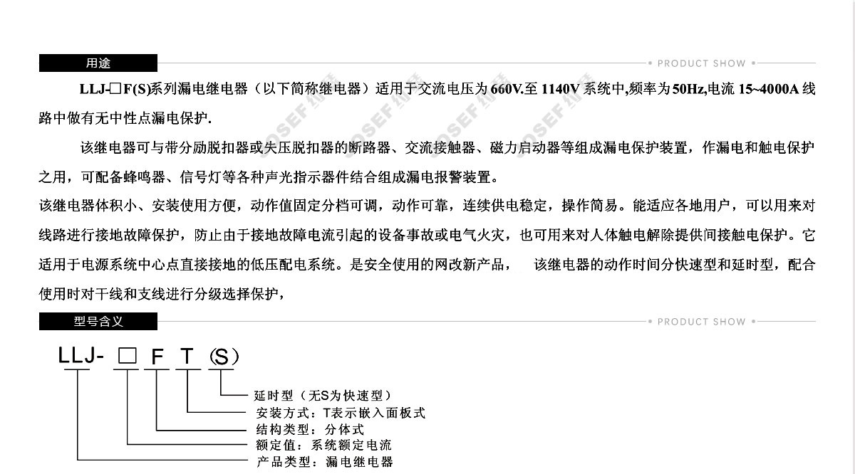 LLJ-FS系列漏电继电器(以下简称继电器)适用于交流电压为660V.至1140V电压系统中,频率为50Hz,电流15~4000A线路中做有无中性点