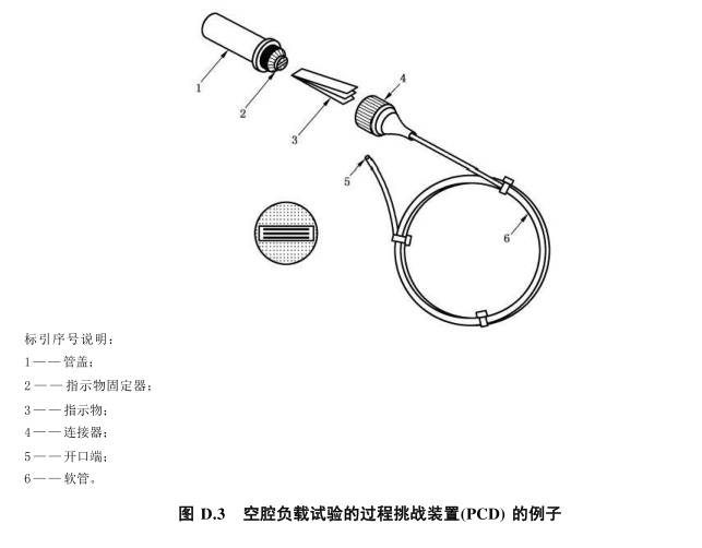 D.10.1空腔负载试验的PCD 由管盖、连接器、指示物固定器、软管组成,如图D.3 所示。化学指示物应符合GB 18282.1的要求,制造商提供化学指示物的选择和使用方法,
